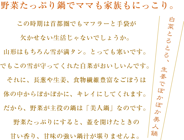 冬の野菜たちはなぜおいしい? 東北の1月、2月は、最低気温が氷点下となる厳しい寒さが続きます。この寒さでは野菜が凍ってしまします。しかし、雪室の中の温度は零度近く湿度は90%以上で安定。真っ暗のなかで によ野菜に劇的な変化がおこります。デンプンは糖に、たんぱく質をアミノ酸にかえ、これらの成分を細胞内に増やして不凍液のようにすることで凍らずに生き続けることができます。この野菜が甘い、旨いと感じるのも納得です。また、この寒さで、害虫や病原菌の活動もおとなしくなり、農薬の使用もほんのわずかで済んでいることもうれしいポイントです。 びっくりするほど甘く、箸を入れればすっと切れる。 この野菜たちを鍋でじっくり煮込むと・・・大根は、びっくりするほど甘く、箸を入れればすっと切れます。香り高く生命力に溢れる長ネギ、身がぎっしり詰まった白菜は、煮込めば煮込むほどにトロりとして実にうまいんです。口に入れた瞬間に広がる野菜の旨味、滋味深い味わいも冬野菜ならでは。 カラダが軽くてすっきり、の野菜鍋。 野菜がおいしいからできる鍋・・・魚肉類を入れずに、たっぷりの野菜と出汁には昆布と干し椎茸、塩だけで作る鍋が新鮮。シンプルながらも奥行きのある深い味わいは、舌の上で素材ひとつひとつの味わいを感じることができます。 香りつけに胡麻油をたらしても、さわやかな柑橘系の薬味を使っても美味。食事を終えるとなんだかカラダが癒されたような、、、。翌朝も目覚めよくカラダが軽くてすっきり、調子がいいんです。 鍋のほかに・・・ ●白菜はシチューするとトロトロで美味。白菜はみずみずしいので、さっぱりおいしいサラダもおすすめです。●大根の肩は甘くて生で、真ん中は煮込んで、先はおろし向きです。スライサーを使ってスライスして水を切り、その上にちりめんじゃこをたっぷりふりかければ簡単サラダに。乱切りにした大根をトマトソースで煮込んだ料理も新鮮。5cmくらにの厚さにカットして圧力鍋で煮れば簡単ふろふき大根に。こんがり焦げ目をつけたステーキも好評。おろしも最高です。●ごぼうは皮に栄養があります。たわしで洗い、皮のままスライス。エグミも少なく水に軽くさらすだけ。薄くスライスしたものをさっとゆがき、ゴマドレッシングをかけてサラダに。また鰹節を利かせた出汁で、大根と人参、長葱などとじっくり煮ればヘルシー野菜スープのできあがり。スープに野菜の旨味がたっぷり、七味唐辛子がよく合います。●長ネギはフライパンでジューッと焼くだけでお酒の肴に。細かく刻んで薬味にすると、舌にのせただけで甘味を感じ、噛み締めたときの辛味がまた格別です。納豆や鍋、中華での薬味として。●生姜は薄くスライスして、紅茶に入れてもいいし、蜂蜜とすり下ろした生姜を入れてお湯を注げば、風邪に負けない簡単健康ドリンクが完成。 使いきりサイズでない野菜たちだからこそ、いろいろな料理ができて楽しいし、食べれば食べるほどに体の調子がよくなるのを感じます。 <インフルエンザ 食事での対策の情報> ●免疫力アップでインフルエンザ予防●誠 Biz.ID:医者要らずでできるインフルエンザ対策:予防接種なしで ●風邪対策!抵抗力アップレシピ - goo グルメ&料理